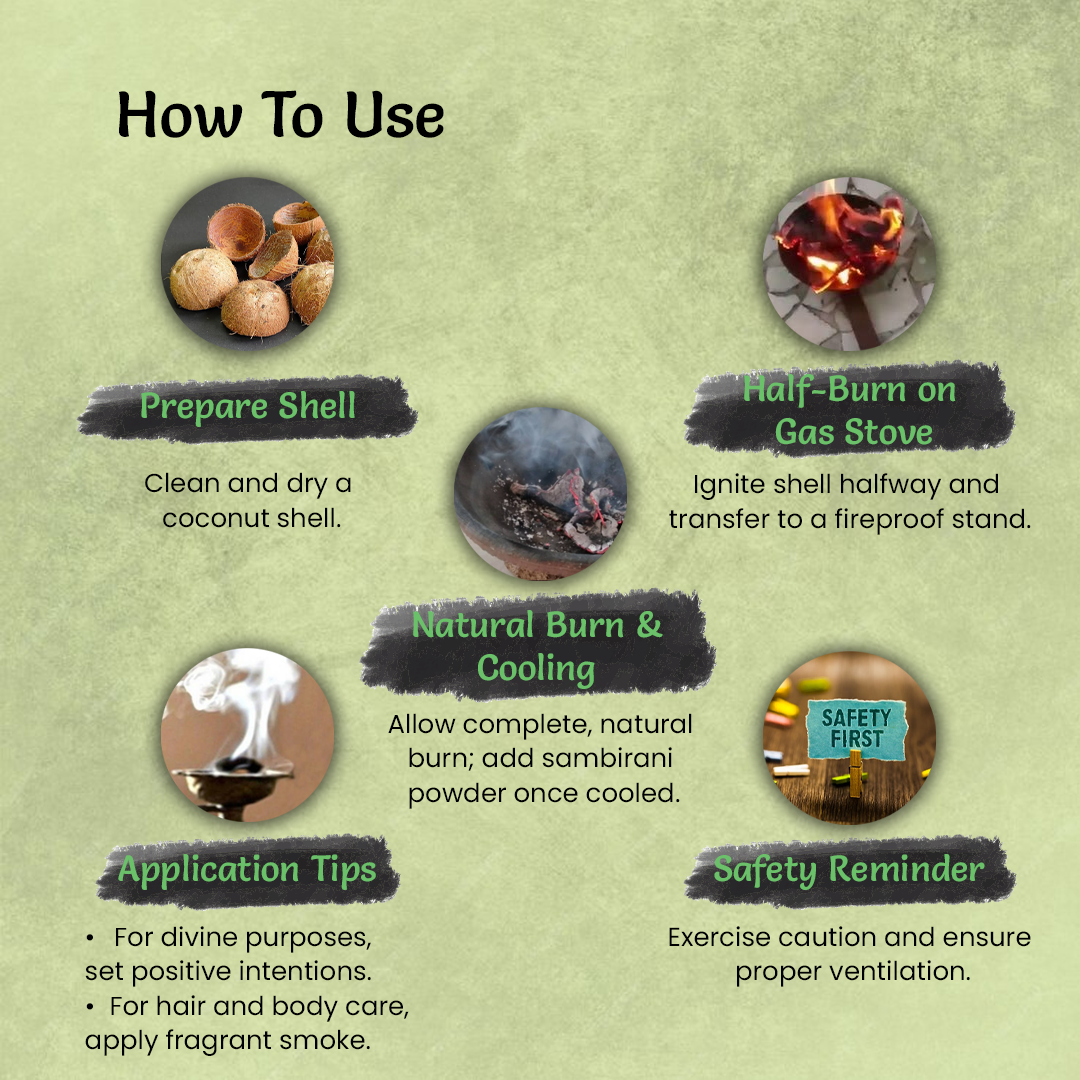 - For spiritual practices, set positive intentions as you add the herbal Sambirani powder to the burnt coconut shell. Allow the fragrant smoke to cleanse and purify the surroundings.