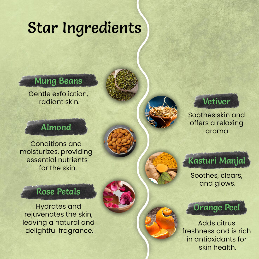 Benefit: Packed with proteins, Green Gram aids in nourishing the skin, providing essential nutrients that leave your skin soft, supple, and radiant.