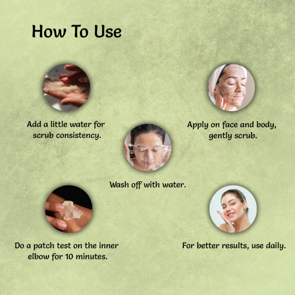 - Since our body scrub comes in powder form, mix a desired amount with a small quantity of water to create a smooth, paste-like consistency.